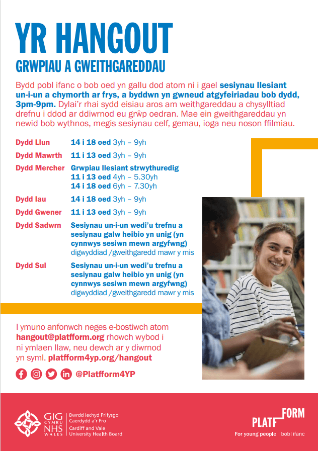 Rydym yn gwybod pa mor bwysig yw hi i bobl ifanc allu cael gafael ar gymorth iechyd meddwl a lles emosiynol pan fo angen. Dyna pam yr ydym wedi creu’r Hangout.