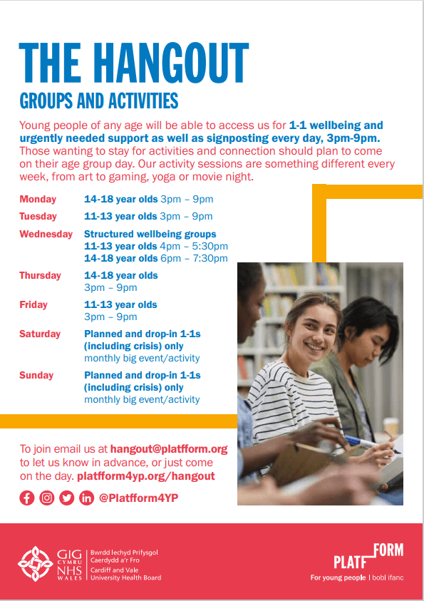 The Hangout team work closely with our other Emotional Wellbeing and Mental Health services for children and young people within Cardiff and Vale University Health Board. This means they are able to talk with other services to make sure young people receive the best support from the right people at the right time to ensure a holistic and complimentary approach to care delivered.